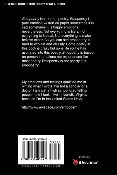 Emopoerty isn't formal poetry. Emopoerty is pure emotion written on paper sometimes it is sad sometimes it is happy emotions nevertheless. Not everything is literal not everything is factual. Not everything is make believe either. As you can see emopoetry is hard to explain and classify. Some poetry in this book is crazy but so is life so life has aspirated into this poetry. Emopoetry is based on personal emotions not experiences like most poetry. Emopoetry is not poetry is emopoetry.