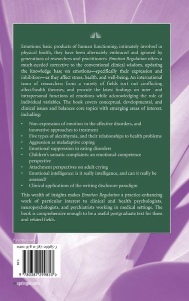 An increasing number of studies have been conducted on the role of expression and regulation of emotion in health. Emotion Regulation addresses the question of these studies from diverse angles while encompassing conceptual, developmental, and clinical issues. Central concepts discussed in this volume that are related to health include: coping styles and aggression, alexithymia, emotional intelligence, emotional expression and depression, emotional expression and anxiety disorders, in addition to the emotional competence in children.