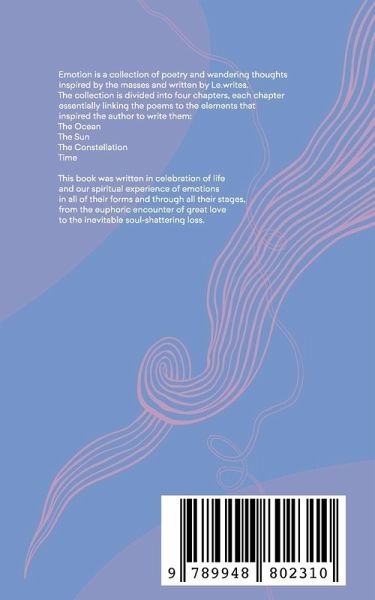 Emotion is a collection of poetry and wandering thoughts inspired by the masses and written by Le.writes. The collection is divided into four chapters, each chapter essentially linking the poems to the elements that inspired the author to write them: The Ocean, The Sun, The Constellation and Time. This book was written in celebration of life and our spiritual experience of emotions in all of their forms and through all their stages, from the euphoric encounter of great love to the inevitable soul-shattering loss.