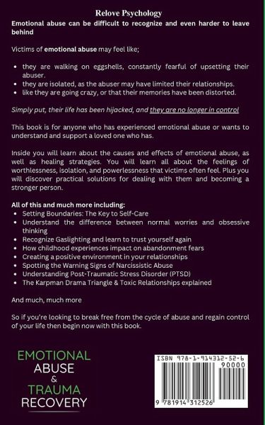 Emotional abuse can be difficult to recognize and even harder to leave behind Victims of emotional abuse may feel like;they are walking on eggshells, constantly fearful of upsetting their abuser. they are isolated, as the abuser may have limited their relationships. like they are going crazy, or that their memories have been distorted. Simply put, their life has been hijacked, and they are no longer in control This book is for anyone who has experienced emotional abuse or wants to understand and support a loved one who has. Inside you will learn about the causes and effects of emotional abuse, as well as healing strategies. You will learn all about the feelings of worthlessness, isolation, and powerlessness that victims often feel. Plus you will discover practical solutions for dealing with them and becoming a stronger person. All of this and much more including:Setting Boundaries: The Key to Self-Care Understand the difference between normal worries and obsessive thinking Recognize Gaslighting and learn to trust yourself again How childhood experiences impact on abandonment fears Creating a positive environment in your relationships Spotting the Warning Signs of Narcissistic Abuse Understanding Post-Traumatic Stress Disorder (PTSD) The Karpman Drama Triangle & Toxic Relationships explained And much, much more So if you're looking to break free from the cycle of abuse and regain control of your life then begin now with this book.