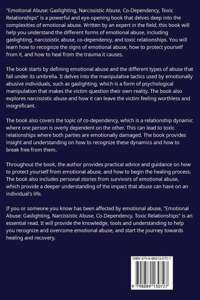 Are you or someone you know suffering from emotional abuse in a relationship? Do you feel like you're constantly being gaslighted or manipulated by a narcissistic partner? Do you feel trapped in a co-dependent cycle, unable to break free from a toxic relationship? If you answered yes to any of these questions, then "Emotional Abuse: Gaslighting, Narcissistic Abuse, Co-Dependency, Toxic Relationships" is the book you've been searching for. This comprehensive guide delves deep into the dynamics of emotional abuse, offering a clear understanding of the various forms it can take and the impact it can have on your mental and emotional well-being. From gaslighting to narcissistic abuse and co-dependency, this book covers it all. You will learn how to recognize the signs of emotional abuse and understand the tactics used by abusers to control and manipulate their victims. With practical tools and actionable advice, this book empowers you to identify toxic patterns in your own relationships and make positive changes to protect your well-being. You don't have to continue suffering in silence. With "Emotional Abuse: Gaslighting, Narcissistic Abuse, Co-Dependency, Toxic Relationships," you will gain the knowledge and confidence you need to take control of your life and build healthy, fulfilling relationships. Don't wait any longer. Get your copy of "Emotional Abuse: Gaslighting, Narcissistic Abuse, Co-Dependency, Toxic Relationships" today and start your journey towards healing and recovery.