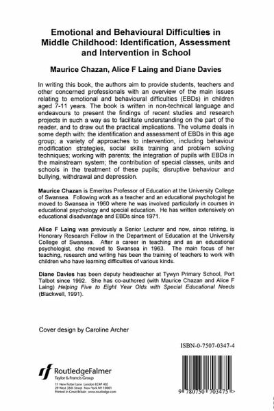 Looking In Depth At The Main Issues Of Emotional And Behavioural difficulties of 7-11 year olds, this book draws on recent study material and projects to suggest practical ways of dealing with such difficulties in schools, and to give a clearer understanding of the problems posed by children with EBDs. Key topics covered include educating children with Emotional And Behavioural Difficulties Ebds In Mainstream And Special schools, disruptive behaviour and bullying, withdrawal, anxiety and depression, identification and assessment and how schools, parents and others can help.