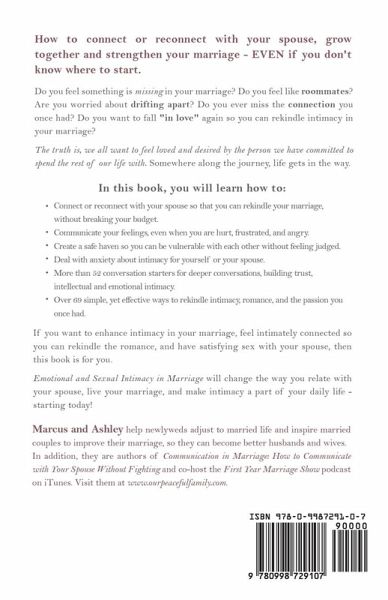 How to connect or reconnect with your spouse, grow together and strengthen your marriage - EVEN if you don't know where to start. Do you feel something is missing in your marriage? Do you feel like roommates? Are you worried about drifting apart? Do you ever miss the connection you once had? Do you want to fall "in love" again so you can rekindle intimacy in your marriage? Needless to say, you are not alone. The truth is, we all want to feel loved and desired by the person we have committed to spend the rest of our life with. Somewhere along the journey, life gets in the way; busy schedules, pregnancies, kids, health issues, looming work deadlines, career changes, unexpected life and family events, etc. Your spouse is physically present with you, but it feels like they are miles away. The spark and excitement is starting to wane. You are slowly growing apart. The sad truth is this: Lack of intimacy in a marriage can easily lead to resentment, anger, frustrations, feeling neglected and even divorce. But, don't give up yet. No matter how hopeless you feel about the state of your marriage, we believe you can rekindle intimacy with your spouse. Because it happened to us too. We used to be just like you, missing that deep connection, meaningful conversations, and excitement we had when we first met. However, we have used what we share in this book to reconnect, grow together and rekindle intimacy in our marriage; emotionally, intellectually, spiritually, physically, sexually, and much more. As a result, we now have a healthier, happier, sexier and satisfying marriage. In this book, you will learn how to: 1. Connect or reconnect with your spouse so that you can rekindle your marriage, without breaking your budget. 2. Overcome emotional, physical, and sexual intimacy issues like mismatched sexual desires in the bedroom. 3. Communicate your feelings with courage, even when you are hurt, frustrated or angry. 4. Create a safe haven so you can be vulnerable with each other without feeling judged. 5. Deal with anxiety about intimacy for yourself or your spouse. 6. The 5 simple things we do every day that has been proven to strengthen intimacy in many marriages; even if you don’t have much time. 7. More than 52 conversation starters for deeper conversations, building trust, intellectual and emotional intimacy. 8. The different forms of intimacy every couple needs to know so you can build that intimate connection you both desire. 9. Over 69 simple, yet effective ways to rekindle intimacy, romance, and the passion you once had. Plus, the 30-day and 12-month intimacy challenge for couples; which is about practicing intimacy in your marriage every single day. You see, a marriage without emotional and sexual intimacy is bound to be unfulfilling. So, if you want to enhance intimacy in your marriage, rekindle the romance, and have satisfying sex with your spouse, then this book is for you. More importantly, Emotional and Sexual Intimacy in Marriage will change the way you relate with your spouse, live your marriage, and make intimacy a part of your daily life - starting today! Now: Get your copy of this intimacy book for couples today.