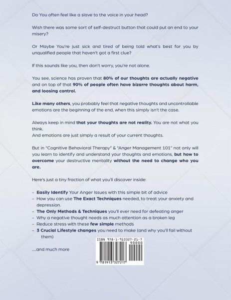 Do You often feel like a slave to the voice in your head? Wish there was some sort of self-destruct button that could put an end to your misery? Or Maybe You’re just sick and tired of being told what’s best for you by unqualified people that haven’t got a first clue? If this sounds like you, then don’t worry, you’re not alone. You see, science has proven that 80% of our thoughts are actually negative and on top of that 90% of people often have bizarre thoughts about harm, and loosing control. Like many others, you probably feel that negative thoughts and uncontrollable emotions are the beginning of the end, when this simply isn’t the case. Always keep in mind that your thoughts are not reality. You are not what you think. And emotions are just simply a result of your current thoughts. But in "Cognitive Behavioral Therapy" & "Anger Management 101" not only will you learn to identify and understand your thoughts and emotions, but how to overcome your destructive mentality without the need to change who you are. Here’s just a tiny fraction of what you’ll discover inside: Easily Identify Your Anger Issues with this simple bit of advice How you can use The Exact Techniques needed, to treat your anxiety and depression. The Only Methods & Techniques you’ll ever need for defeating anger Why a negative thought needs as much attention as a broken leg Reduce stress with these few simple methods 3 Crucial Lifestyle changes you need to make (and why you’ll fail without them) ….and much more Just take a second or two to imagine yourself finally getting your life back on track without the need of those costly therapy sessions or daily pills. Can you really say to yourself that this wouldn’t be worth it? So If you’re tired of drowning in your own head and want to once again be that person your family and friends adored, Just Scroll Up and Try This Book Out Today.