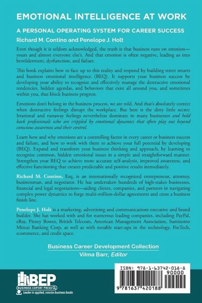 Even though it is seldom acknowledged, the truth is that business runs on emotion-yours and almost everyone else's. And that emotion is often negative, leading us into bewilderment, dysfunction, and failure. This book explains how to face up to this reality and respond by building street smarts and business emotional intelligence (BEQ). It supports your business success by developing your ability to recognize and effectively manage the destructive emotional tendencies, hidden agendas, and behaviors that exist all around you, and sometimes within you, that block business progress. Emotions don't belong in the business process, we are told. And that's absolutely correct when destructive feelings disrupt the workplace. But here is the dirty little secret: Irrational and runaway feelings nevertheless dominate in many businesses and hold back professionals who are crippled by emotional dynamics that often play out beyond conscious awareness and their control. Learn how and why emotions are a controlling factor in every career or business success and failure, and how to work with them to achieve your full potential by developing (BEQ). Expand and transform your business thinking and approach, by learning to recognize common, hidden emotional issues in a simple and straightforward manner. Strengthen your BEQ to achieve more accurate self-analysis, improved awareness, and effective functioning that creates predictable and positive results immediately.
