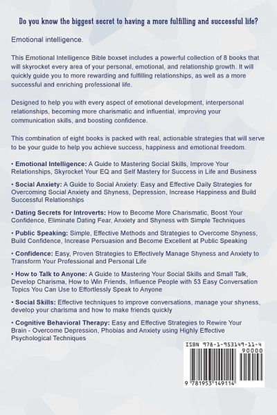 Do you know the biggest secret to having a more fulfilling and successful life? Emotional intelligence. In fact, happiness is actually a trainable and attainable skill! This Emotional Intelligence Bible boxset includes a powerful collection of 8 books that will skyrocket every area of your personal, emotional, and relationship growth. You will quickly learn how to have more rewarding and fulfilling relationships, as well as a more successful and enriching professional life. Designed to help you with every aspect of emotional development, interpersonal relationships, becoming more charismatic and influential, improving your communication skills, and boosting confidence. This combination of eight books packed with real, actionable strategies that will serve to be your guide to achieve success, happiness and emotional freedom.Emotional Intelligence: A Guide to Mastering Social Skills, Improve Your Relationships, Skyrocket Your EQ and Self Mastery for Success in Life and Business Social Anxiety: A Guide to Social Anxiety: Easy and Effective Daily Strategies for Overcoming Social Anxiety and Shyness, Depression, Increase Happiness and Build Successful Relationships Dating Secrets for Introverts: How to Become More Charismatic, Boost Your Confidence, Eliminate Dating Fear, Anxiety and Shyness with Simple Techniques Public Speaking: Simple, Effective Methods and Strategies to Overcome Shyness, Build Confidence, Increase Persuasion and Become Excellent at Public Speaking Confidence: Easy, Proven Strategies to Effectively Manage Shyness and Anxiety to Transform Your Professional and Personal Life How to Talk to Anyone: A Guide to Mastering Your Social Skills and Small Talk, Develop Charisma, How to Win Friends, Influence People with 53 Easy Conversation Topics You Can Use to Effortlessly Speak to Anyone Social Skills: Effective techniques to improve conversations, manage your shyness, develop your charisma and how to make friends quickly Cognitive Behavioral Therapy: Easy and Effective Strategies to Rewire Your Brain - Overcome Depression, Phobias and Anxiety using Highly Effective Psychological Techniques Inside you will discover ...How to Confront Anxiety and Shyness Head-On Effective Dating Strategies How to Combat Unhelpful, Intrusive Thoughts How to Connect the dots between Spirituality and Self-Help How to Build a Better Relationship with Yourself How to Break Free from Bad Habits and Enjoy Life! How to Make More Meaningful Connections with others We guarantee each book is filled with powerful, actionable and effective strategies you can start implementing in your life immediately.Click "BUY NOW" and jumpstart your personal growth journey today!