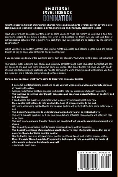 Take the guesswork out of understanding human nature and learn how to leverage proven psychological techniques and loopholes to become a better, charismatic and effectively persuasive leader! Have you ever been described as "tone deaf" or being unable to "read the room"? Do you have a hard time convincing people to do things a certain way, even if it's beneficial for them? Are you sick and tired of self-sabotaging behaviour that is holding you back from your true potential and is costing you life-changing opportunities? Would you like to completely overhaul your internal mental processes and become a clear, lucid and logical thinker, as well as boost your confidence and personal power? If you answered yes to any of the questions above, then pay attention. Your whole world is about to be changed. The world of today is lighting-fast, flexible and extremely competitive and those who adapt the fastest and can get people to like and trust them will always come out on top. This super bundle will equip you with deadly effective tips, techniques and strategies you need to dominate the world around you and will transform you from the inside-out into a naturally charismatic and confident person. Here's a tiny fraction of what you're going to discover in this super bundle: 6 powerful mental reframing questions to ask yourself when dealing with a particularly bad case of negative thoughts A simple, but effective gratitude exercise worksheet to help you trigger powerful positive emotions The four keys to rewiring your thought processes and becoming a powerful force of positivity and self-confidence 9 dead-simple, but massively underrated ways to improve your mental health right now Step-by-step instructions to help you kick the habit of procrastination to the curb Why using willpower to quit bad habits and negative thinking will fail 94% of the time and a better way to do it The 5 powerful approaches to understanding human behaviour at an instinctual level The only 3 things to watch out for if you want to predict and anticipate how someone will behave in near or far future The best way to put out a friendly vibe and get people to trust you while remaining dominant and strong How to read the unconscious body language signals and figure out their intentions The 5 secret techniques of manipulation used by history's most charismatic people that are so powerful, they're bordering on mind control How to develop high-level self-awareness, monitor your thoughts and quell useless internal chatter Under-the-radar Neuro-Linguistic Programming techniques to help you get into the minds of other people and make them bow to your will ...and much, much more! Take a moment to imagine how your life would be transformed once you're able to grasp and apply the principles of psychology and persuasion and get into the minds of other people, as well as change self-sabotaging thinking patterns and become a better version of yourself. It doesn't matter what your goal is. Whether you want to become a better communicator, leader or colleague and learn how to get what you want out of other people and the world, this special bundle is packed full with deep insights and practical advice about the human nature that will help you better understand yourself and others in a way that's genuine and beneficial to everyone.