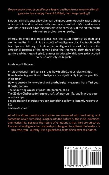 If you want to know yourself more deeply, and how to use emotional intelligence to live a happy life and fulfilled, then keep reading!! Emotional intelligence allows human beings to be emotionally aware about other people and to behave with emotional sensitivity. Men and women with these skills set have the capacity to be conscious of their interactions with others and to have empathy. Interest in emotional intelligence has increased recently as men and women realize that this is an aspect of intelligence that has traditionally been ignored. Although it is clear that intelligence is one of the keys to the emotional progress of the human being, the traditional definitions of this quality and the measuring instruments associated with it have so far proved to be completely inadequate Inside you'll discover: What emotional intelligence is, and how it affects your relationships How developing emotional intelligence can significantly improve your life in all areas How to decode the emotional and psychological messages that affect your thought pattern The underlying causes of poor interpersonal skills The 21-day Challenge to help you restructure your life, and improve your relationships Simple tips and exercises you can start doing today to instantly raise your EQ and much more! All of the above questions and more are answered with fascinating, and sometimes even surprising, insights into the nature of the mind, emotions, and leadership. Because the nature of emotions is that they are personal, Emotional Intelligence for Leadership is designed to address the leader - in this case, you - directly. It is a guidebook, from one leader to another.