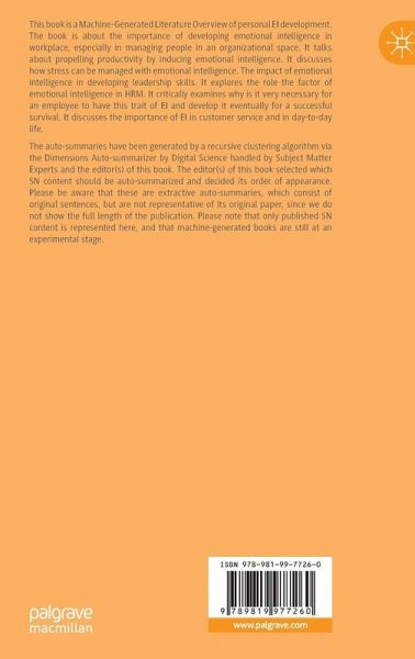 This book is a Machine-Generated Literature Overview of personal EI development. The book is about the importance of developing emotional intelligence in workplace, especially in managing people in an organizational space. It talks about propelling productivity by inducing emotional intelligence. It discusses how stress can be managed with emotional intelligence. The impact of emotional intelligence in developing leadership skills. It explores the role the factor of emotional intelligence in HRM. It critically examines why is it very necessary for an employee to have this trait of EI and develop it eventually for a successful survival. It discusses the importance of EI in customer service and in day-to-day life.