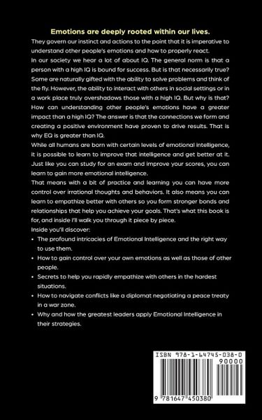 Emotions are deeply rooted within our lives. They govern our instinct and actions to the point that it is imperative to understand other people’s emotions and how to properly react. In our society we hear a lot of about IQ. The general norm is that a person with a high IQ is bound for success. But is that necessarily true? Some are naturally gifted with the ability to solve problems and think of the fly. However, the ability to interact with others in social settings or in a work place truly overshadows those with a high IQ. But why is that? How can understanding other people’s emotions have a greater impact than a high IQ? The answer is that the connections we form and creating a positive environment have proven to drive results. That is why EQ is greater than IQ. While all humans are born with certain levels of emotional intelligence, it is possible to learn to improve that intelligence and get better at it. Just like you can study for an exam and improve your scores, you can learn to gain more emotional intelligence. That means with a bit of practice and learning you can have more control over irrational thoughts and behaviors. It also means you can learn to empathize better with others so you form stronger bonds and relationships that help you achieve your goals. That’s what this book is for, and inside I’ll walk you through it piece by piece. Inside you’ll discover: The profound intricacies of Emotional Intelligence and the right way to use them. How to gain control over your own emotions as well as those of other people. Secrets to help you rapidly empathize with others in the hardest situations. How to navigate conflicts like a diplomat negotiating a peace treaty in a war zone. Why and how the greatest leaders apply Emotional Intelligence in their strategies. If you feel like your mind controls you or if you feel like you just don’t "get" other people then this book is a lifeline for you. Inside I’ll show you how to thrive in an emotion-dominated world by honing an ancient primal instinct into a well-defined skill you can tap into anytime. When you apply what you learn in this book, your life can change completely. You can connect better with other people. You can manage your own mind. You can start to move in the directions you’ve always wanted to go. If that’s what you’re searching for, you found it. Scroll up and order your copy of Emotional Intelligence today!