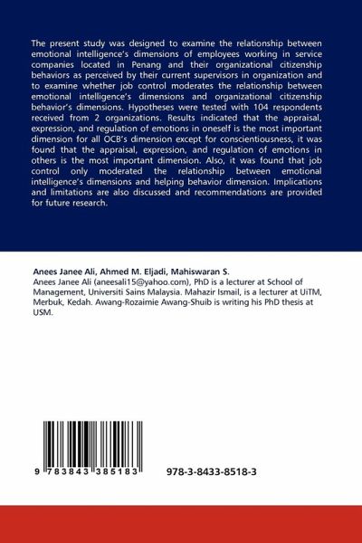 The present study was designed to examine the relationship between emotional intelligence's dimensions of employees working in service companies located in Penang and their organizational citizenship behaviors as perceived by their current supervisors in organization and to examine whether job control moderates the relationship between emotional intelligence's dimensions and organizational citizenship behavior's dimensions. Hypotheses were tested with 104 respondents received from 2 organizations. Results indicated that the appraisal, expression, and regulation of emotions in oneself is the most important dimension for all OCB's dimension except for conscientiousness, it was found that the appraisal, expression, and regulation of emotions in others is the most important dimension. Also, it was found that job control only moderated the relationship between emotional intelligence's dimensions and helping behavior dimension. Implications and limitations are also discussed and recommendations are provided for future research.