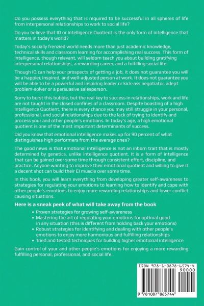 Do you possess everything that is required to be successful in all spheres of life from interpersonal relationships to work to social life? Do you believe that IQ or Intelligence Quotient is the only form of intelligence that matters in today’s world? Today’s socially frenzied world needs more than just academic knowledge, technical skills and classroom learning for accomplishing real success. This form of intelligence, though relevant, will seldom teach you about building gratifying interpersonal relationships, a rewarding career, and a fulfilling social life. Though IQ can help your prospects of getting a job, it does not guarantee you will be a happier, inspired, and well-adjusted person at work. It does not guarantee you will be able to be a powerful and inspiring leader or kick-ass negotiator, adept problem-solver or a persuasive salesperson. Sorry to burst this bubble, but the real key to success in relationships, work and life are not taught in the closed confines of a classroom. Despite boasting of a high Intelligence Quotient, there is every chance you may still struggle in your personal, professional, and social relationships due to the lack of trying to identify and process your and other people’s emotions. In today’s age, a high emotional quotient is one of the most important determinants of success. Did you know that emotional intelligence makes up for 90 percent of what distinguishes high performers from the average ones? The good news is that emotional intelligence is not an inborn trait that is mostly determined by genetics, unlike intelligence quotient. It is a form of intelligence that can be gained over some time through consistent effort, discipline, and practice. Anyone wanting to improve their emotional quotient and willing to give it a decent shot can build their EI muscle over some time. In this book, you will learn everything from developing greater self-awareness to strategies for regulating your emotions to learning how to identify and cope with other people’s emotions to enjoy more rewarding relationships and lower conflict causing situations. Gain control of your and other people’s emotions for enjoying a more rewarding fulfilling personal, professional, and social life.