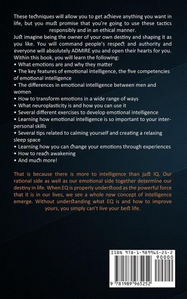 These techniques will allow you to get achieve anything you want in life, but you must promise that you're going to use these tactics responsibly and in an ethical manner. Just imagine being the owner of your own destiny and shaping it as you like. You will command people's respect and authority and everyone will absolutely ADMIRE you and open their hearts for you. Within this book, you will learn the following: ¿ What emotions are and why they matter ¿ The key features of emotional intelligence, the five competencies of emotional intelligence ¿ The differences in emotional intelligence between men and women ¿ How to transform emotions in a wide range of ways ¿ What neuroplasticity is and how you can use it ¿ Several different exercises to develop emotional intelligence ¿ Learning how emotional intelligence is so important to your interpersonal skills ¿ Several tips related to calming yourself and creating a relaxing sleep space ¿ Learning how you can change your emotions through experiences ¿ How to reach awakening ¿ And much more! That is because there is more to intelligence than just IQ. Our rational side as well as our emotional side together determine our destiny in life. When EQ is properly understood as the powerful force that it is in our lives, we see a whole new concept of intelligence emerge. Without understanding what EQ is and how to improve yours, you simply can't live your best life.