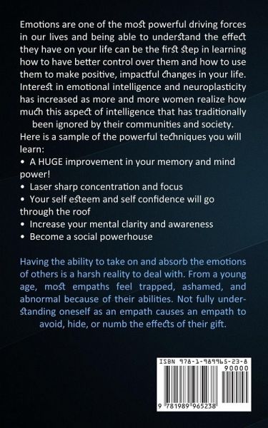 Emotions are one of the most powerful driving forces in our lives and being able to understand the effect they have on your life can be the first step in learning how to have better control over them and how to use them to make positive, impactful changes in your life. Interest in emotional intelligence and neuroplasticity has increased as more and more women realize how much this aspect of intelligence that has traditionally been ignored by their communities and society. Here is a sample of the powerful techniques you will learn: ¿ A HUGE improvement in your memory and mind power! ¿ Laser sharp concentration and focus ¿ Your self esteem and self confidence will go through the roof ¿ Increase your mental clarity and awareness ¿ Become a social powerhouse Having the ability to take on and absorb the emotions of others is a harsh reality to deal with. From a young age, most empaths feel trapped, ashamed, and abnormal because of their abilities. Not fully understanding oneself as an empath causes an empath to avoid, hide, or numb the effects of their gift.