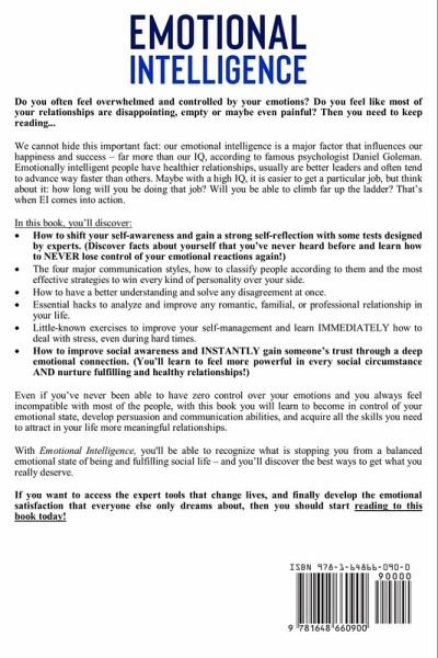Do you often feel overwhelmed and controlled by your emotions? Do you feel like most of your relationships are disappointing, empty or maybe even painful? Then you need to keep reading... We cannot hide this important fact: our emotional intelligence is a major factor that influences our happiness and success - far more than our IQ, according to famous psychologist Daniel Goleman. Emotionally intelligent people have healthier relationships, usually are better leaders and often tend to advance way faster than others. Maybe with a high IQ, it is easier to get a particular job, but think about it: how long will you be doing that job? Will you be able to climb far up the ladder? That's when EI comes into action. In this book, you'll discover:How to shift your self-awareness and gain a strong self-reflection with some tests designed by experts. (Discover facts about yourself that you've never heard before and learn how to NEVER lose control of your emotional reactions again!) The four major communication styles, how to classify people according to them and the most effective strategies to win every kind of personality over your side. How to have a better understanding and solve any disagreement at once. Essential hacks to analyze and improve any romantic, familial, or professional relationship in your life. Little-known exercises to improve your self-management and learn IMMEDIATELY how to deal with stress, even during hard times. How to improve social awareness and INSTANTLY gain someone's trust through a deep emotional connection. (You'll learn to feel more powerful in every social circumstance AND nurture fulfilling and healthy relationships!) Even if you've never been able to have zero control over your emotions and you always feel incompatible with most of the people, with this book you will learn to become in control of your emotional state, develop persuasion and communication abilities, and acquire all the skills you need to attract in your life more meaningful relationships. With Emotional Intelligence, you'll be able to recognize what is stopping you from a balanced emotional state of being and fulfilling social life - and you'll discover the best ways to get what you really deserve. If you want to access the expert tools that change lives, and finally develop the emotional satisfaction that everyone else only dreams about, then you should start reading to this book today!
