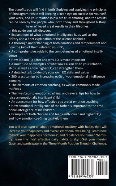 The benefits you will find in both studying and applying the principles of Enneagram (while still keeping a keen eye on success for yourself, your work, and your relationships) are truly amazing, and the results can be seen by the people who, both today and throughout history, have achieved great results in their lifetimes. In this guide you will discover: Explanations of what emotional intelligence is, as well as the history and a brief explanation of the science behind it A thorough understanding of both emotions and temperament and how the two of them relate to your EQ A comprehensive guide to the competencies of emotional intelligence How EQ and IQ differ and why EQ is more important A multitude of examples of what low EQ can do to your relationships, as well as how higher EQ can strengthen them A detailed test to identify your own EQ skills and values 200 practical tips to increasing each of your emotional intelligence domains The elements of emotion coaching, as well as commonly made mistakes The five steps to emotion coaching, and several tips for how to raise an emotionally intelligent child An assessment for how effective you are at emotion coaching How emotional intelligence of the father is important to the emotional intelligence of his children Examples of both children and teens with lower and higher EQs and how emotion coaching can help them You will also learn all about emotional mastery with habits that will increase your happiness and overall emotional well-being. Learn how to hack your 'happiness hormones'; and rebalance your inner chemistry, learn the most effective daily habits to skyrocket your mental state, and participate in the Three Month Positive Thought Challenge.