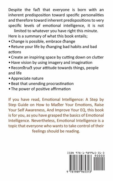 Despite the fact that everyone is born with an inherent predisposition toward specific personalities and therefore toward inherent predispositions to very specific levels of emotional intelligence, it is not limited to whatever you have right this minute. Here is a summary of what this book entails; Change is possible, embrace change Retune your life by changing bad habits and bad actions Create an inspiring space by cutting down on clutter Have vision by using imagery and imagination Reconstruct your attitude towards things, people and life Appreciate nature Beat that unending procrastination The power of positive affirmation If you have read, Emotional Intelligence: A Step by Step Guide on How to Master Your Emotions, Raise Your Self Awareness, And Improve Your EQ, this book is for you, as you have grasped the basics of Emotional Intelligence. Nevertheless, Emotional Intelligence is a topic that everyone who wants to take control of their feelings should be reading.