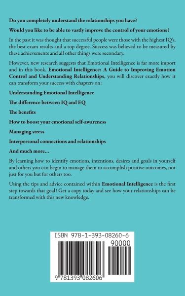 Do you completely understand the relationships you have? Would you like to be able to vastly improve the control of your emotions? In the past it was thought that successful people were those with the highest IQ's, the best exam results and a top degree. Success was believed to be measured by these achievements and all other things were secondary. However, new research suggests that Emotional Intelligence is far more import and in this book, Emotional Intelligence: A Guide to Improving Emotion Control and Understanding Relationships, you will discover exactly how it can transform your success with chapters on: Understanding Emotional Intelligence The difference between IQ and EQ The benefits How to boost your emotional self-awareness Managing stress Interpersonal connections and relationships And much more… By learning how to identify emotions, intentions, desires and goals in yourself and others you can begin to manage them to accomplish positive outcomes, not just for you but for others too. Using the tips and advice contained within Emotional Intelligence is the first step towards that goal! Get a copy today and see how your relationships can be transformed with this new knowledge.