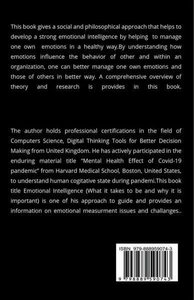 ""Emotional Intelligence: What it takes to be and why it is important"" This book provides an outline of human mind and emotional intelligence; In the fast-paced world we live in, it's easy to get caught up in the whirlwind of daily tasks and responsibilities. However, as we navigate through life, we often find that it's not just our intellectual abilities that determine our success, but also our emotional intelligence. In this book, we delve into the concept of emotional intelligence a comprehensive guide to understanding and improving your emotional skills. It's an essential read for anyone looking to navigate the complexities of life and achieve greater success in their personal and professional lives.