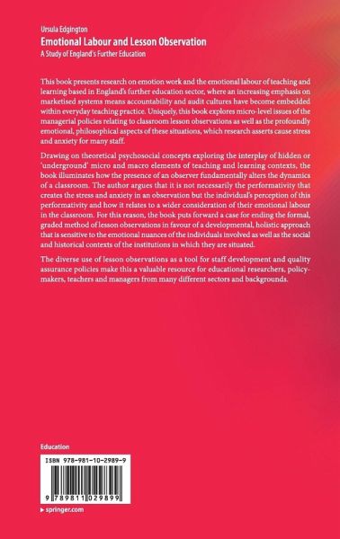 This book presents research on emotion work and the emotional labour of teaching and learning based in England's further education sector, where an increasing emphasis on marketised systems means accountability and audit cultures have become embedded within everyday teaching practice. Uniquely, this book explores micro-level issues of the managerial policies relating to classroom lesson observations as well as the profoundly emotional, philosophical aspects of these situations, which research asserts cause stress and anxiety for many staff.