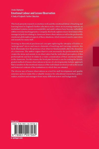 This book presents research on emotion work and the emotional labour of teaching and learning based in England's further education sector, where an increasing emphasis on marketised systems means accountability and audit cultures have become embedded within everyday teaching practice. Uniquely, this book explores micro-level issues of the managerial policies relating to classroom lesson observations as well as the profoundly emotional, philosophical aspects of these situations, which research asserts cause stress and anxiety for many staff.