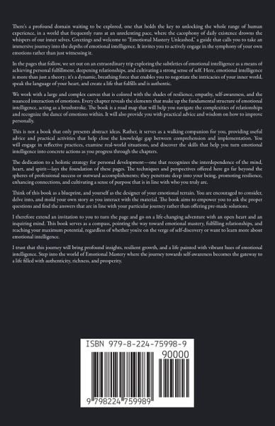 There's a profound domain waiting to be explored, one that holds the key to unlocking the whole range of human experience, in a world that frequently runs at an unrelenting pace, where the cacophony of daily existence drowns the whispers of our inner selves. Greetings and welcome to "Emotional Mastery Unleashed," a guide that calls you to take an immersive journey into the depths of emotional intelligence. It invites you to actively engage in the symphony of your own emotions rather than just witnessing it. In the pages that follow, we set out on an extraordinary trip exploring the subtleties of emotional intelligence as a means of achieving personal fulfillment, deepening relationships, and cultivating a strong sense of self. Here, emotional intelligence is more than just a theory; it's a dynamic, breathing force that enables you to negotiate the intricacies of your inner world, speak the language of your heart, and create a life that fulfills and is authentic. We work with a large and complex canvas that is colored with the shades of resilience, empathy, self-awareness, and the nuanced interaction of emotions. Every chapter reveals the elements that make up the fundamental structure of emotional intelligence, acting as a brushstroke. The book is a road map that will help you navigate the complexities of relationships and recognize the dance of emotions within. It will also provide you with practical advice and wisdom on how to improve personally. This is not a book that only presents abstract ideas. Rather, it serves as a walking companion for you, providing useful advice and practical activities that help close the knowledge gap between comprehension and implementation. You will engage in reflective practices, examine real-world situations, and discover the skills that help you turn emotional intelligence into concrete actions as you progress through the chapters. The dedication to a holistic strategy for personal development-one that recognizes the interdependence of the mind, heart, and spirit-lays the foundation of these pages. The techniques and perspectives offered here go far beyond the spheres of professional success or outward accomplishments; they penetrate deep into your being, promoting resilience, enhancing connections, and cultivating a sense of purpose that is in line with who you truly are. Think of this book as a blueprint, and yourself as the designer of your emotional terrain. You are encouraged to consider, delve into, and mold your own story as you interact with the material. The book aims to empower you to ask the proper questions and find the answers that are in line with your particular journey rather than offering pre-made solutions. I therefore extend an invitation to you to turn the page and go on a life-changing adventure with an open heart and an inquiring mind. This book serves as a compass, pointing the way toward emotional mastery, fulfilling relationships, and reaching your maximum potential, regardless of whether you're on the verge of self-discovery or want to learn more about emotional intelligence. I trust that this journey will bring profound insights, resilient growth, and a life painted with vibrant hues of emotional intelligence. Step into the world of Emotional Mastery where the journey towards self-awareness becomes the gateway to a life filled with authenticity, richness, and prosperity.