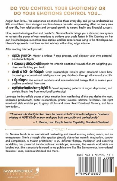 Do You Control Your Emotions? Or Do Your Emotions Control You... Anger, fear, love... We experience emotions like these every day, and yet we understand so little about them. Your strongest emotions have a dramatic, empowering effect on every area of your life, from relationships and personal growth, to career, health and financial success. Award winning author and coach Dr. Navana Kundu brings you a dynamic new system to harness the power of your emotions to achieve your goals fastest in life. Drawing on her own life challenges, numerous case studies, and her experiences living in the Himalayas, Dr. Navana's approach combines ancient wisdom with cutting edge science. After reading this book you will: ¿ Break through: Master a unique 7 step process, and discover your own personal emotional hotspots ¿ Heal your inner child: Repair the chronic emotional wounds that are weighing you down and holding you back ¿ Build a new foundation: Great relationships require great emotions! Learn how improving your emotional intelligence can pay dividends through all areas of your life. ¿ Get healthy: Use ancient traditions and science-backed Energy Diet to sustain your positive emotional flow state. ¿ Create the life of your dreams: Smash repeating patterns of anger, depression, and anxiety. Break free from emotional bankruptcy! Leverage the incredible power of your emotion into manifesting all that you desire the most. Enhanced productivity, better relationships, greater success, ultimate fulfilment.. The right emotional state enables you to grasp all this and more. Read Emotional Mastery, and learn how today...