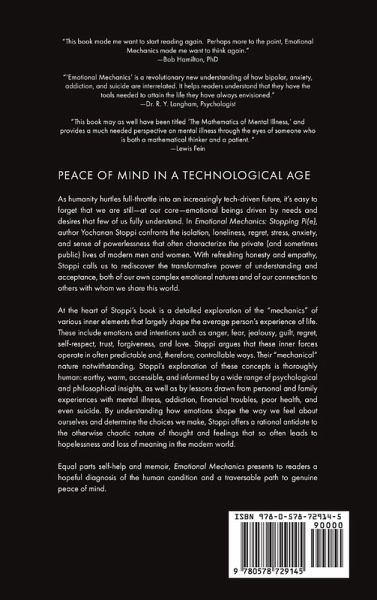 As humanity hurtles full-throttle into an increasingly tech-driven future, it's easy to forget that we are still-at our core-emotional beings driven by needs and desires that few of us fully understand. In Emotional Mechanics: Stopping Pi(e), author Yochanan Stoppi confronts the isolation, loneliness, regret, stress, anxiety, and sense of powerlessness that often characterize the private (and sometimes public) lives of modern men and women. With refreshing honesty and empathy, Stoppi calls us to rediscover the transformative power of understanding and acceptance, both of our own complex emotional natures and of our connection to others with whom we share this world. At the heart of Stoppi's book is a detailed exploration of the "mechanics" of various inner elements that largely shape the average person's experience of life. These include emotions and intentions such as anger, fear, jealousy, guilt, regret, self-respect, trust, forgiveness, and love. Stoppi argues that these inner forces operate in often predictable and, therefore, controllable ways. Their "mechanical" nature notwithstanding, Stoppi's explanation of these concepts is thoroughly human: earthy, warm, accessible, and informed by a wide range of psychological and philosophical insights, as well as by lessons drawn from personal and family experiences with mental illness, addiction, financial troubles, poor health, and even suicide. By understanding how emotions shape the way we feel about ourselves and determine the choices we make, Stoppi offers a rational antidote to the otherwise chaotic nature of thought and feelings that so often leads to hopelessness and loss of meaning in the modern world. Equal parts self-help and memoir, Emotional Mechanics presents to readers a hopeful diagnosis of the human condition and a traversable path to genuine peace of mind.