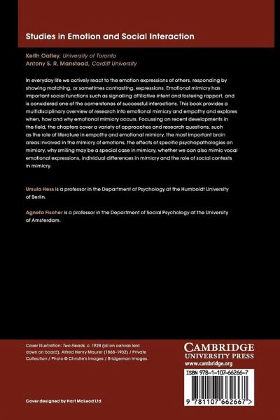 Introduction: why and how we mimic emotions Agneta H. Fischer and Ursula Hess; 1. On the sharing of mind Keith Oatley; 2. The role of mimicry in understanding the emotions of others Mariëlle Stel; 3. Revisiting the simulation of smiles model: the what, when, and why of mimicking smiles Paula M. Niedenthal, Sebastian Korb, Adrienne Wood and Magdalena Rychlowska; 4. The neuroscience of mimicry during social interactions Leo Schilbach; 5. The social dimension as antecedent and effect of emotional mimicry Ursula Hess, Isabell Hühnerl, Job van der Schalk and Agneta H. Fischer; 6. More than just a mirror: examining the cross-channel mimicry of emotional expressions Skyler Hawk and Agneta H. Fischer; 7. Emotional mimicry: underlying mechanisms and individual differences Marianne Sonnby-Borgström; 8. Mimicry, emotion, and social context: insights from typical and atypical humans, robots, and androids Piotr Winkielman, Liam C. Kavanagh and Evan Carr; 9. The neurological basis of empathy and mimicry Miriam Schuler, Sebastian Mohnke and Henrik Walter; 10. Conclusion: towards a better understanding of emotional mimicry Ursula Hess and Agneta H. Fischer.