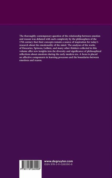 The thoroughly contemporary question of the relationship between emotion and reason was debated with such complexity by the philosophers of the 17th century that their concepts remain a source of inspiration for todayâ??s research about the emotionality of the mind. The analyses of the works of Descartes, Spinoza, Leibniz, and many other thinkers collected in this volume offer new insights into the diversity and significance of philosophical reflections about emotions during the early modern era. A focus is placed on affective components in learning processes and the boundaries between emotions and reason.