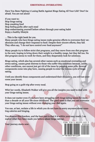 Have You Been Fighting A Losing Battle Against Binge Eating All Your Life? Don't be afraid. You are not alone! If you want to: Stop binge eating Stop sneaking food Stop feeling guilty after each meal Stop embarrassing yourself before others through your eating habit Enjoy a healthy lifestyle ... This is the right book for you. Many people who have binge eating issues make genuine efforts to overcome their weaknesses and change their response to food. Despite their sincere efforts, they fail. They often say, "I do not have control over food anymore!" Many people try to follow strict diet programs, and they move from one diet program to the next, hoping to bring down their weight to a healthy range, but they fail too. No diet program seems to work for them, and they desperately look for solutions. Binge eating, which also has several other names such as emotional overeating and stress eating, causes great distress to those who suffer this condition because, unlike other conditions, one cannot just get rid of the issue by popping some pills. Several components come into play here, causing people to enter the vicious cycle of binge eating. Until you identify these components and understand their dynamics, you will not overcome your issues. Stop going on a guilt trip after every meal. With her words, Elisabeth Walker will give you all the insights you need to deal with your binge eating issues. It does not matter even if you have been struggling with binge eating issues for more than a decade or all your life since childhood. The good news is that you can overcome your binge eating issues without ever changing your diet again. You can, at last, reclaim a life in which you do not have to worry anymore about counting calories and binging. You deserve this freedom, and the best part is that it is within your easy reach. ( no matter what they have made you believe about binge eating). Your journey starts now.