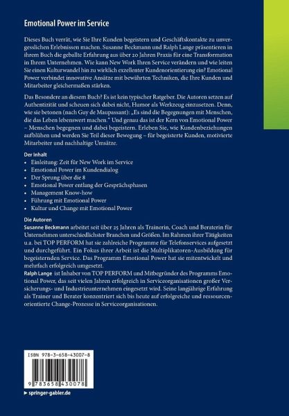 Dieses Buch verrät, wie Sie Ihre Kunden begeistern und Geschäftskontakte zu unvergesslichen Erlebnissen machen. Susanne Beckmann und Ralph Lange präsentieren in ihrem Buch die geballte Erfahrung aus über 20 Jahren Praxis für eine Transformation in Ihrem Unternehmen. Wie kann New Work Ihren Service verändern und wie leiten Sie einen Kulturwandel hin zu wirklich exzellenter Kundenorientierung ein? Emotional Power verbindet innovative Ansätze mit bewährten Techniken, die Ihre Kunden und Mitarbeiter gleichermaßen stärken.