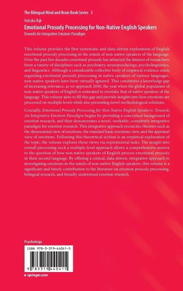 This volume provides the first systematic and data-driven exploration of English emotional prosody processing in the minds of non-native speakers of the language. Over the past few decades emotional prosody has attracted the interest of researchers from a variety of disciplines such as psychiatry, neuropsychology, psycholinguistics, and linguistics. Although a considerable collective body of empirical evidence exists regarding emotional prosody processing in native speakers of various languages, non-native speakers have been virtually ignored. This constitutes a knowledge gap of increasing relevance, as we approach 2050, the year when the global population of non-native speakers of English is estimated to overtake that of native speakers of the language. This volume aims to fill this gap and provide insights into how emotions are processed on multiple levels while also presenting novel methodological solutions.