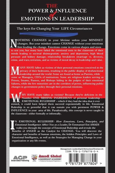 The Power and Influence of Emotions in Leadership NOTHING CHANGES in your lifetime unless your MINDSET changes. But your mindset cannot CHANGE without your emotions first leading the change. Emotions come in various shapes and sizes to test you, but many have failed the emotional tests in the classroom of their minds leading to societal disintegration: anxiety and depression, high blood pressure and kidney damage; relationship breakdown (marriage vs. divorce), crime, and wars; terrorism, and as victims of moral decay in leadership and value. MANY HAVE fallen as victims of their personal emotions conceived in the privacy of their bedrooms, resulting in the public display of dysfunctional leadership around the world. Some are found at home as Parents, while some as Managers, and CEOs of institutions. Some are religious leaders serving as Priests, Imams, Pastors, and Bishops hiding in the pulpit of their emotional failures, while the selected minorities are leaders in the corridors of power in government, influencing changes in public policy through their personal emotions. WHY HAVE many fallen as victims? Because they're deficient in the Number ONE MISSING INGREDIENT of personal leadership - EMOTIONAL RULERSHIP - which if they had the idea that it ever existed, it could have helped them succeed exponentially in life. Emotional Rulership is so powerful that it can sustain you with persistent POWER & INFLUENCE in your area of life. Paradoxically, this concept is never taught in the classroom - either formally or informally. IN EMOTIONAL RULERSHIP: How Emotions, Laws, Principles, and Emotional Intelligence Affect You as a Leader, Dr Emmanuel Eni AMADI walks you through the concept of Emotional Rulership and reveals the Benefits of ANGER as the Catalyst for CHANGE. You will discover the character and benefits of human emotions, the hidden Principles and Laws of Emotional Intelligence, as well as the Strategies for Managing Change in your organization or any life events.