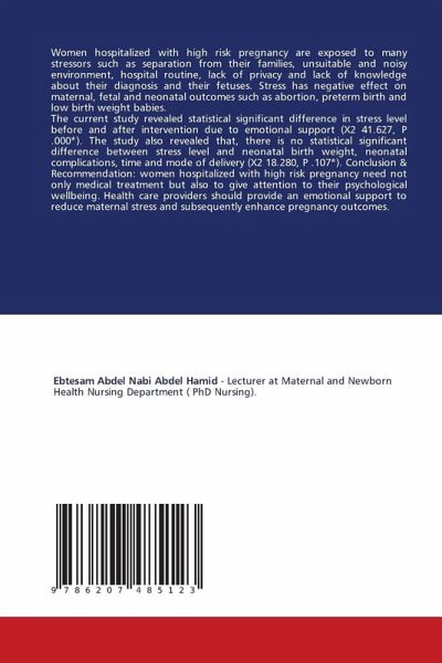 Women hospitalized with high risk pregnancy are exposed to many stressors such as separation from their families, unsuitable and noisy environment, hospital routine, lack of privacy and lack of knowledge about their diagnosis and their fetuses. Stress has negative effect on maternal, fetal and neonatal outcomes such as abortion, preterm birth and low birth weight babies. The current study revealed statistical significant difference in stress level before and after intervention due to emotional support (X2 41.627, P .000_). The study also revealed that, there is no statistical significant difference between stress level and neonatal birth weight, neonatal complications, time and mode of delivery (X2 18.280, P .107_). Conclusion & Recommendation: women hospitalized with high risk pregnancy need not only medical treatment but also to give attention to their psychological wellbeing. Health care providers should provide an emotional support to reduce maternal stress and subsequently enhance pregnancy outcomes.