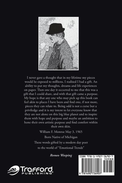 > Emotional Trendz is a lifetime of uncertainty for Romeo Weeping. A tuff gruff style exemplifies a courageous man with the gifted mission. Romeo Weeping lives in the transition of everyday life. He is no more capable of controlling his emotion than he is driven to write. The following represent a lifetime of a thousand of literary pieces he has composed, it is here you will only begin to understand the why to Romeo Weeping. I would venture to guess that as much as we feel we understand this man, we are so very wrong. He writes not because he needs to, he writes to survive the turbulent world in which he attempts to understand. I'm not sure after meeting him and editing his work that I understand more than the simple fact that he is compelled to appreciate what little he has controlled of. In his own way he understands better than most of us, and shares this with an honesty some people would just refuse to accept. I hope that he writes forever.