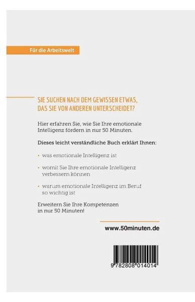 Alles über emotionale Intelligenz in nur 50 Minuten Sie verfügen über viele Kompetenzen aber Sie wollen sich noch weiterentwickeln? Dann erklärt Ihnen dieses Buch, warum Sie Ihre emotionale Intelligenz fördern sollten. Jeder Mensch besitzt sie und ist in der Lage, sie zu verbessern. Wer einen hohen emotionalen Quotienten (EQ) hat, versteht sich besser mit seinen Mitmenschen, fühlt sich ausgeglichener und neigt weniger zu unkontrollierten Gefühlsausbrüchen. All diese Eigenschaften können sowohl in Ihrem Privatleben als auch im Beruf nur von Vorteil sein! Nach 50 Minuten können Sie: ¿ emotionale Intelligenz von kognitiver Intelligenz unterscheiden ¿ Ihre emotionalen Kompetenzen ausbauen ¿ sich und Ihre Mitmenschen besser verstehen Starten Sie mit diesen praktischen Tipps voll durch! Über 50MINUTEN.DE Für die Arbeitswelt Was bringt Sie im Job weiter? Die Serie Für die Arbeitswelt der Reihe 50Minuten ist für alle geeignet, die sich ¿ egal auf welchem Abschnitt ihrer Karriere ¿ neue persönliche und berufliche Kompetenzen aneignen, ihr Potenzial optimal ausschöpfen oder einfach ihre Work-Life-Balance hinterfragen wollen. Unsere kompakten Titel enthalten nicht nur eine von Experten erstellte Übersicht über die relevante Theorie, sondern auch konkrete Anleitungen, die von zahlreichen Beispielen unterstützt werden. Die einfache und leicht verständliche Formulierung der komplexen Sachverhalte ist somit der ideale Ausgangspunkt für Angestellte, Arbeitgeber und Arbeitssuchende.