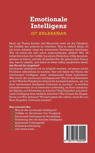 Kaum ein Thema berührt den Menschen mehr als die Fähigkeit, die Gefühle des anderen zu verstehen. Was so einfach klingt, ist bis heute mitunter eines der schwersten Unterfangen überhaupt. Wie oft haben Sie sich schon missverstanden gefühlt? Wie oft hatten Sie schon das Gefühl, bei einem Menschen völlig danebengelegen zu haben, und wie oft dachten Sie, Sie gäben einer Person das, was ihr zusteht, und dabei ist diese völlig unzufrieden damit, wie Sie mit ihr umgehen?Emotionale Intelligenz soll es möglich machen, auf genau solche Probleme aufmerksam zu machen. Hier soll daher das Thema der emotionalen Intelligenz einen umfassenden Raum bekommen. Was macht die emotionale Intelligenz aus? Was ist das Besondere an ihr? Welche Fähigkeiten können Sie bewusst trainieren, um von Ihrer emotionalen Intelligenz Gebrauch zu machen? In welchen Lebensbereichen ist es besonders notwendig, an Ihren emotionalen Stärken und Schwächen zu arbeiten? Sind Empathie und emotionale Intelligenz denn wirklich erlernbar? Wie können Sie Ängste, Stress und Wut abbauen? Worauf müssen Sie achten, wenn Sie von Ihrer Empathie Gebrauch machen?Das erwartet Sie:-Was ist die emotionale Intelligenz?-Gefühle vs. Emotionen: Der Vergleich-Emotionale Intelligenz im Berufsalltag-Umsetzung der emotionalen Intelligenz-Spannende Fallbeispiele-Achtsamkeitstraining-und vieles mehr ...
