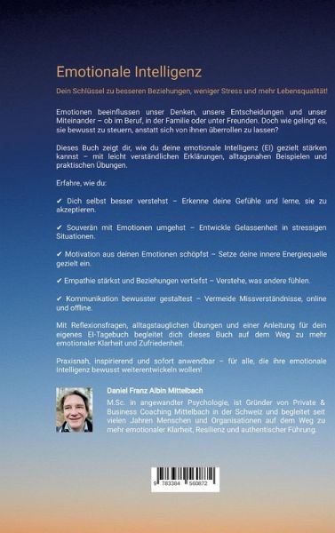 Emotionale Intelligenz leicht gemacht - Dein Schlüssel zu mehr Gelassenheit, Empathie und erfolgreichen BeziehungenEmotionen bestimmen unser Leben - sie beeinflussen unsere Entscheidungen, Beziehungen und unser Wohlbefinden. Doch wie oft lassen wir uns von Wut, Stress oder Unsicherheit überrollen, anstatt bewusst mit unseren Gefühlen umzugehen? Dieses Buch zeigt dir, wie du emotionale Intelligenz gezielt in deinem Alltag einsetzt, um gelassener zu reagieren, Missverständnisse zu vermeiden und tiefere Verbindungen zu anderen Menschen aufzubauen.Mit leicht verständlichen Erklärungen, vielen Praxisbeispielen und sofort umsetzbaren Übungen lernst du Schritt für Schritt:- wie du deine eigenen Emotionen besser erkennst und verstehst- wie du deine Gefühle gezielt steuern kannst, statt dich von ihnen beherrschen zu lassen- wie du Empathie entwickelst und deine sozialen Fähigkeiten stärkst- wie du mit Stress, Konflikten und schwierigen Gesprächen souverän umgehst- wie emotionale Intelligenz dir in der digitalen Kommunikation hilftOhne Fachchinesisch, dafür mit viel Herz, Humor und praxisnahen Tipps bietet dieses Buch einen alltagstauglichen Einstieg in die Welt der emotionalen Intelligenz. Egal ob im Beruf, in der Familie oder in Freundschaften - entdecke, wie du deine Emotionen als wertvolle Kraftquelle nutzen kannst und dadurch dein Leben bewusster und erfüllter gestaltest.