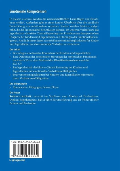 In diesem essential werden die wissenschaftlichen Grundlagen von Emotionen erklärt. Außerdem gibt es einen kurzen Überblick über die kindliche Entwicklung von emotionalem Verhalten. Zudem werden Faktoren aufgezählt, die die Emotionalität beeinflussen können. Im weiteren Verlauf wird das hypothetisch-deduktive Clinical Reasoning zum Erstellen einer therapeutischen Diagnose bei Kindern und Jugendlichen mit Störungen der Emotionalität eingesetzt. Am Ende bietet dieses essential Interventionsmöglichkeiten für Kinder und Jugendliche, um das emotionale Verhalten zu verbessern.