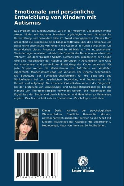 Das Problem des Kinderautismus wird in der modernen Gesellschaft immer akuter. Kinder mit Autismus brauchen psychologische und pädagogische Unterstützung und besondere Hilfe im Sozialisierungsprozess. Dieses Buch präsentiert die Ergebnisse einer Längsschnittstudie über die emotionale und persönliche Entwicklung von Kindern mit Autismus in frühen Schuljahren. Die Besonderheit dieses Prozesses wird im Hinblick auf die intrapersonalen Veränderungen analysiert, nämlich die Dynamik der Beziehung zwischen dem "Wahren" und dem "Falschen Selbst". Gemäss den Ergebnissen der Studie wird eine Klassifikation der Autismus-Störungen in Abhängigkeit vom Grad der emotionalen und persönlichen Entwicklung der Kinder entwickelt. Für jede Gruppe werden die Mechanismen des Auftretens von Verstößen zugeordnet, Kompensationswege und Varianten der Dynamik beschrieben. Die Bedeutung der Symbolisierungsfähigkeit für die Bewertung des Wohlbefindens bei der persönlichen Entwicklung und Anpassung an die Umwelt wird aufgezeigt. Die erhaltene Klassifikation kann in der Diagnostik, bei der Erstellung von Entwicklungs- und Sozialisationsprognosen, bei der Planung von Therapiestrategien verwendet werden. Die Präsentation der Ergebnisse der Studie wird durch Fallstudien und Materialien zur Fallanalyse ergänzt. Das Buch richtet sich an Spezialisten - Psychologen und Lehrer.