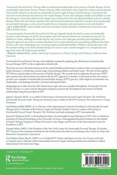 The book sets out a theoretical framework for mental health professionals to enhance their conceptualization of family dynamics, considering a broad range of presenting problems and family groups. The first section applies EFT theory and principles to the practice of family therapy. The second section explicates the process of EFT and examines the interventions associated with the EFT approach to families. In the final section, the authors provide case examples of emotionally focused family therapy (EFFT) practice, with chapters on traumatic loss, stepfamilies, externalizing disorders, and internalizing disorders.
