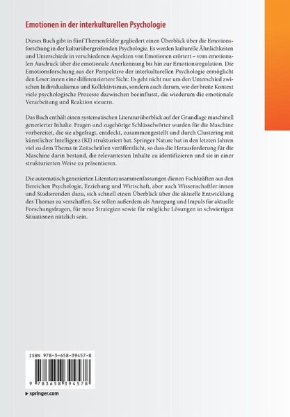 Dieses Buch gibt in fünf Themenfelder gegliedert einen Überblick über die Emotionsforschung in der kulturübergreifenden Psychologie. Es werden kulturelle Ähnlichkeiten und Unterschiede in verschiedenen Aspekten von Emotionen erörtert - vom emotionalen Ausdruck über die emotionale Anerkennung bis hin zur Emotionsregulation. Die Emotionsforschung aus der Perspektive der interkulturellen Psychologie ermöglicht den Leser:innen eine differenziertere Sicht: Es geht nicht nur um den Unterschied zwischen Individualismus und Kollektivismus, sondern auch darum, wie der breite Kontext viele psychologische Prozesse dazwischen beeinflusst, die wiederum die emotionale Verarbeitung und Reaktion steuern. Das Buch enthält einen systematischen Literaturüberblick auf der Grundlage maschinell generierter Inhalte. Fragen und zugehörige Schlüsselwörter wurden für die Maschine vorbereitet, die sie abgefragt, entdeckt, zusammengestellt und durch Clustering mit künstlicher Intelligenz (KI) strukturiert hat. Springer Nature hat in den letzten Jahren viel zu dem Thema in Zeitschriften veröffentlicht, so dass die Herausforderung für die Maschine darin bestand, die relevantesten Inhalte zu identifizieren und sie in einer strukturierten Weise zu präsentieren. Die automatisch generierten Literaturzusammenfassungen dienen Fachkräften aus den Bereichen Psychologie, Erziehung und Wirtschaft, aber auch Wissenschaftler:innen und Studierenden dazu, sich schnell einen Überblick über die aktuelle Entwicklung des Themas zu verschaffen. Sie sollen außerdem als Anregung und Impuls für aktuelle Forschungsfragen, für neue Strategien sowie für mögliche Lösungen in schwierigen Situationen nützlich sein.