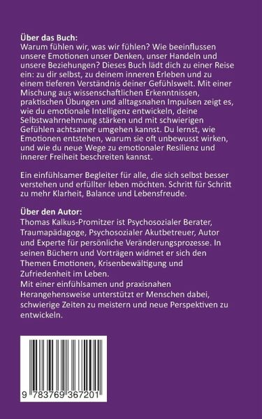 Warum fühlen wir, was wir fühlen? Wie beeinflussen unsere Emotionen unser Denken, unser Handeln und unsere Beziehungen? Dieses Buch lädt dich zu einer Reise ein: zu dir selbst, zu deinem inneren Erleben und zu einem tieferen Verständnis deiner Gefühlswelt. Mit einer Mischung aus wissenschaftlichen Erkenntnissen, praktischen Übungen und alltagsnahen Impulsen zeigt es, wie du emotionale Intelligenz entwickeln, deine Selbstwahrnehmung stärken und mit schwierigen Gefühlen achtsamer umgehen kannst. Du lernst, wie Emotionen entstehen, warum sie oft unbewusst wirken, und wie du neue Wege zu emotionaler Resilienz und innerer Freiheit beschreiten kannst. Ein einfühlsamer Begleiter für alle, die sich selbst besser verstehen und erfüllter leben möchten. Schritt für Schritt zu mehr Klarheit, Balance und Lebensfreude.