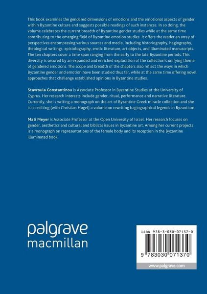 Forward; David Konstan.- INTRODUCTION.- 1. Towards an Approach to Gendered Emotions in Byzantine Culture: An Introduction; Mati Meyer.- PART I.- 2. 'Emotioning' Gender: Plotting the Male and the Female in Byzantine Greek Passions and Lives of Holy Couples; Andria Andreou.- 3. Pity and Lamentation in the Authorial Personae of John Kaminiates and Anna Komnene; Leonora Neville.- 4. Gendering Grief: Emotional Eunuchs - Consoling Constantine the Paphlagonian; Shaun Tougher.- PART II.- 5. Justifiably Angry or Simply Angry?: Empresses in Byzantine Society; Andriani Georgiou.- 6. Emotions on Stage: The 'Manly' Woman Martyr in the Menologion of Basil II; Valentina Cantone.- PART III.- 7. Eros as Passion, Affection and Nature: Gendered Perceptions of Erotic Emotion in Byzantium; Charis Messis and Ingela Nilsson.- 8. 'Weaver of Tales': The Veroli Box and the Power of Eros in Byzantium; Diliana Angelova.- 9. Stirring up Sundry Emotions in the Byzantine Illuminated Book: Reflections on the Female Body; Mati Meyer.- CONCLUSIONS.- 10. Gendered Emotions and Affective Genders: A Response; Stavroula Constantinou.