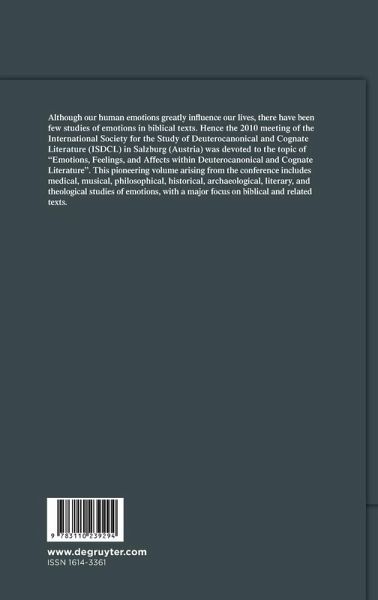 Although our human emotions greatly influence our lives, there have been few studies of emotions in biblical texts. Hence the 2010 meeting of the International Society for the Study of Deuterocanonical and Cognate Literature in Salzburg (Austria) was devoted to the topic of "Emotions, Feelings, and Affects within Deuterocanonical and Cognate Literature". This pioneering volume arising from the conference includes medical, musical, philosophical, historical, archaeological, literary, and theological studies of emotions, with a major focus on biblical and related texts.