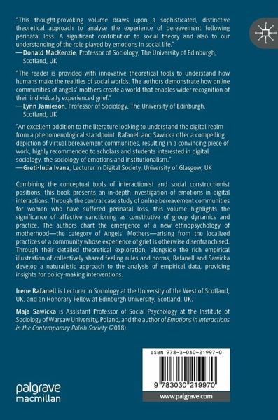Combining the conceptual tools of interactionist and social constructionist positions, this book presents an in-depth investigation of emotions in digital interactions. Through the central case study of online bereavement communities for women who have suffered perinatal loss, this volume highlights the significance of affective sanctioning as constitutive of group dynamics and practice. The authors chart the emergence of a new ethnopsychology of motherhood-the category of 'Angels' Mothers'-arising from the localized practices of a community whose experience of grief is otherwise disenfranchised. Through their detailed theoretical exploration of the centrality of micro-situational dynamics, alongside the rich empirical illustration of collectively shared feeling rules and norms, Rafanell and Sawicka develop a naturalistic approach to the analysis of empirical data, providing insights for policy-making interventions.