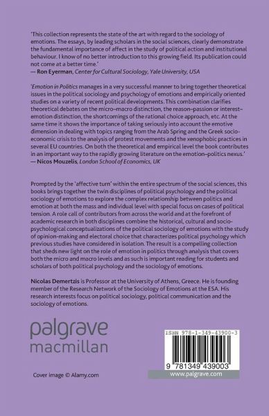 Emotion in Politics manages in a very successful manner to bring together theoretical issues in the political sociology and psychology of emotions and empirically oriented studies on a variety of recent political developments. This combination clarifies theoretical debates on the micro-macro distinction, the reason-passion or interest-emotion distinction, the shortcomings of the rational choice approach etc. At the same time it shows the importance of taking seriously into account the emotive dimension in dealing with topics ranging from the Arab Spring and the Greek socioeconomic crisis to the analysis of protest movements and the xenophobic practices in several EU countries. On both the theoretical and empirical level the book contributes in an important way to the rapidly growing literature on the emotion-politics nexus.