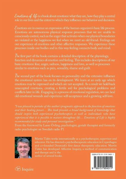 Emotions of life is a book about emotions: what they are, how they play a central role in our lives and the extent to which they influence our behavior and decisions. Emotions are in essence an expression of the human organisms basic life process. Emotions are autonomous physical response processes that we are unable to consciously control, such as the anger that activates when our physical boundaries are violated or the happiness we feel when we meet an old friend. Feelings are our experience of emotions and other affective responses. We experience these processes inside our bodies and in this way feeling connects body and mind. The first part of the book contains a detailed description of the physiology, function and dynamics of emotion and feeling. This includes descriptions of our basic emotions: fear, anger, sadness, happiness and love, as well as processes similar to emotions such as pain, sexuality, shame and guilt. The second part of the book focuses on personality and the extensive influence the emotional system has on its development. We learn at an early age which emotions may be expressed and which are not accepted. As a result we hold back unaccepted emotions, creating a fertile soil for psychological problems and conflicts later in life. Engaging in a process of emotional regulation, we can heal old emotional wounds and experience self-acceptance and a growing self-love.