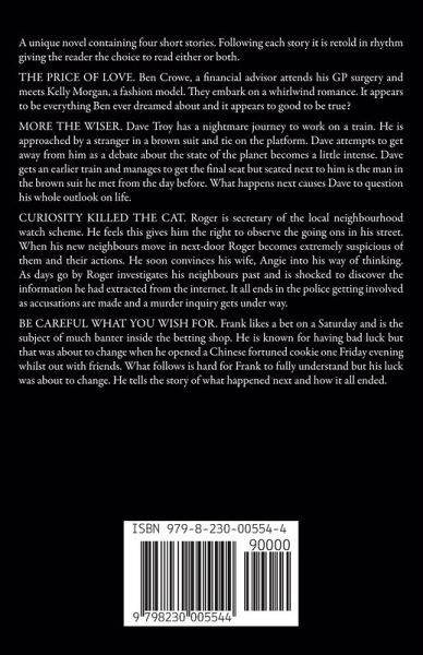 A unique novel containing four short stories. Following each story it is retold in rhythm giving the reader the choice to read either or both. THE PRICE OF LOVE. Ben Crowe, a financial advisor attends his GP surgery and meets Kelly Morgan, a fashion model. They embark on a whirlwind romance. It appears to be everything Ben ever dreamed about and it appears to good to be true? MORE THE WISER. Dave Troy has a nightmare journey to work on a train. He is approached by a stranger in a brown suit and tie on the platform. Dave attempts to get away from him as a debate about the state of the planet becomes a little intense. Dave gets an earlier train and manages to get the final seat but seated next to him is the man in the brown suit he met from the day before. What happens next causes Dave to question his whole outlook on life. CURIOSITY KILLED THE CAT. Roger is secretary of the local neighbourhood watch scheme. He feels this gives him the right to observe the going ons in his street. When his new neighbours move in next-door Roger becomes extremely suspicious of them and their actions. He soon convinces his wife, Angie into his way of thinking. As days go by Roger investigates his neighbours past and is shocked to discover the information he had extracted from the internet. It all ends in the police getting involved as accusations are made and a murder inquiry gets under way. BE CAREFUL WHAT YOU WISH FOR. Frank likes a bet on a Saturday and is the subject of much banter inside the betting shop. He is known for having bad luck but that was about to change when he opened a Chinese fortuned cookie one Friday evening whilst out with friends. What follows is hard for Frank to fully understand but his luck was about to change. He tells the story of what happened next and how it all ended.